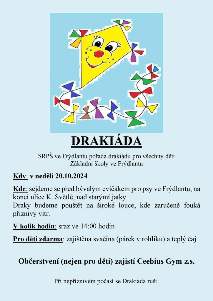 Milí žáci, vážení rodiče, SRPŠ při ZŠ Frýdlant pořádá v neděli 20. října 2024 od 14:00 hodin tradiční Drakiádu pro děti a rodiče.